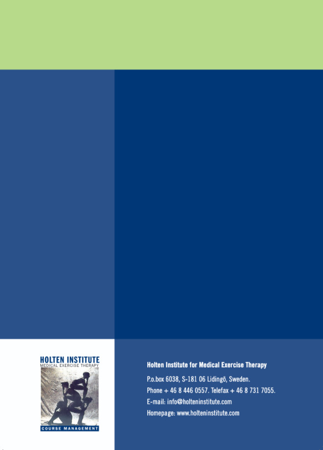DVD digitalizzato (video di 101 minuti in quattro clip) del manuale di esercizi (81 pagine) in cui Tom Arild presenta ogni esercizio insieme a un paziente, mostrando la posizione iniziale e finale e come viene eseguito.